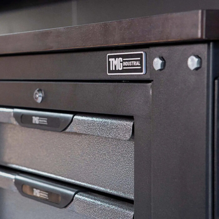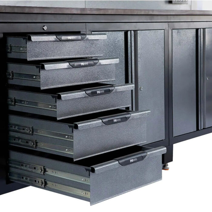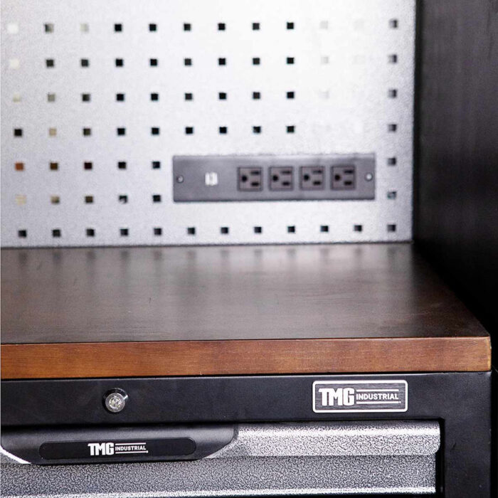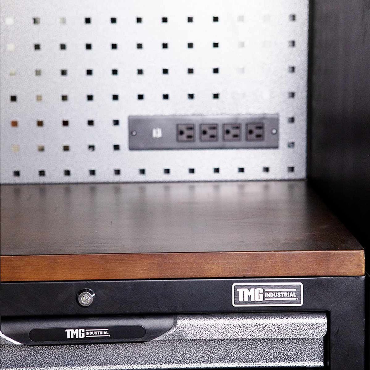 The TMG-WBC10 Extreme-Duty Steel Garage Beech Wood Workbench is a versatile, commercial strength tool storage and work surface solution for your home garage, repair shop, automotive business or any other industrial setting. Maximum storage possibilities through strategically placed pegboards and lockable slide drawers and cabinets of varying sizes. 10' beech walnut finished work surface for long term smooth workflow that is resistant to scratches, impact and wear. Specifications